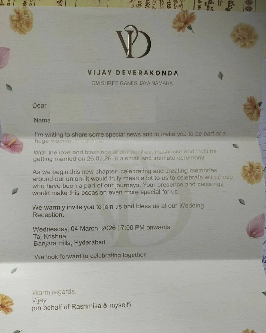 పెళ్లి కేవలం కొద్దిమంది మధ్యే జరిగినా, సినిమా ఇండస్ట్రీ మిత్రుల కోసం, శ్రేయోభిలాషుల కోసం హైదరాబాద్‌లో భారీ రిసెప్షన్ ఏర్పాటు చేశారు. వైరల్ అవుతున్న ఇన్విటేషన్ ప్రకారం, 2026 మార్చి 4 (బుధవారం) సాయంత్రం 7 గంటల నుండి బంజారాహిల్స్‌లోని తాజ్ కృష్ణ హోటల్‌లో ఈ వేడుక జరగనుంది. ఇప్పటికే విజయ్ దేవరకొండ స్వయంగా తెలంగాణ ముఖ్యమంత్రి రేవంత్ రెడ్డిని కలిసి ఆహ్వాన పత్రికను అందజేసినట్లుగా వార్తలు వస్తున్నాయి.